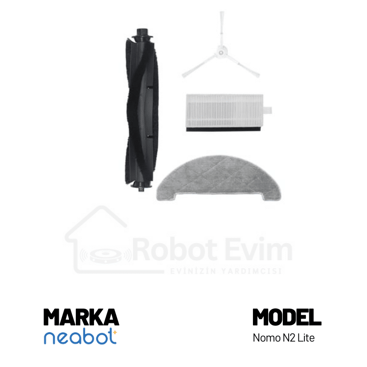 Neabot marka Nomo N2 Lite modeli robot süpürgeniz için Orjinal siyah aksesuar seti. Paket içeriği; 1 adet ana fırça, 1 adet yan fırça, 1 adet hepa filtre, 1 adet mop bezi