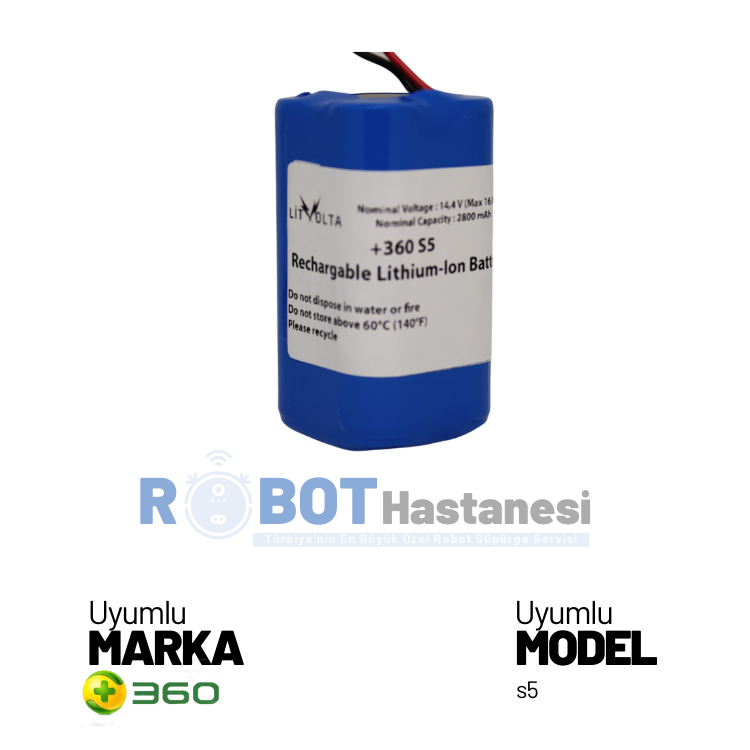 360 marka S5 modeli robot süpürgeniz için yedek batarya / pil yedek parçası. Ürün S5 modeli için %100 uyumlu , tüm testlerden geçmiş ve garantili olarak aynı gün kargo avantajı ile satıştadır.
