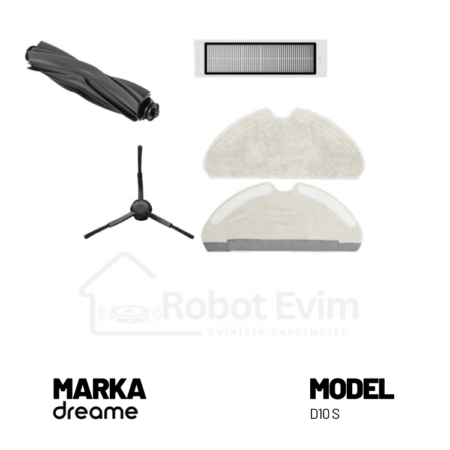 Dreame marka D10 S modeli robot süpürgeniz için Orjinal aksesuar seti. Paket içeriği; 1 adet ana fırça, 1 adet yan fırça, 1 adet hepa filtre, 2 adet mop bezi