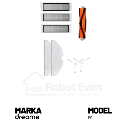 Dreame marka F9 modeli robot süpürgeniz için Orjinal üç filtreli aksesuar seti. Paket içeriği; 1 adet ana fırça, 2 adet yan fırça, 3 adet hepa filtre, 2 adet mop bezi