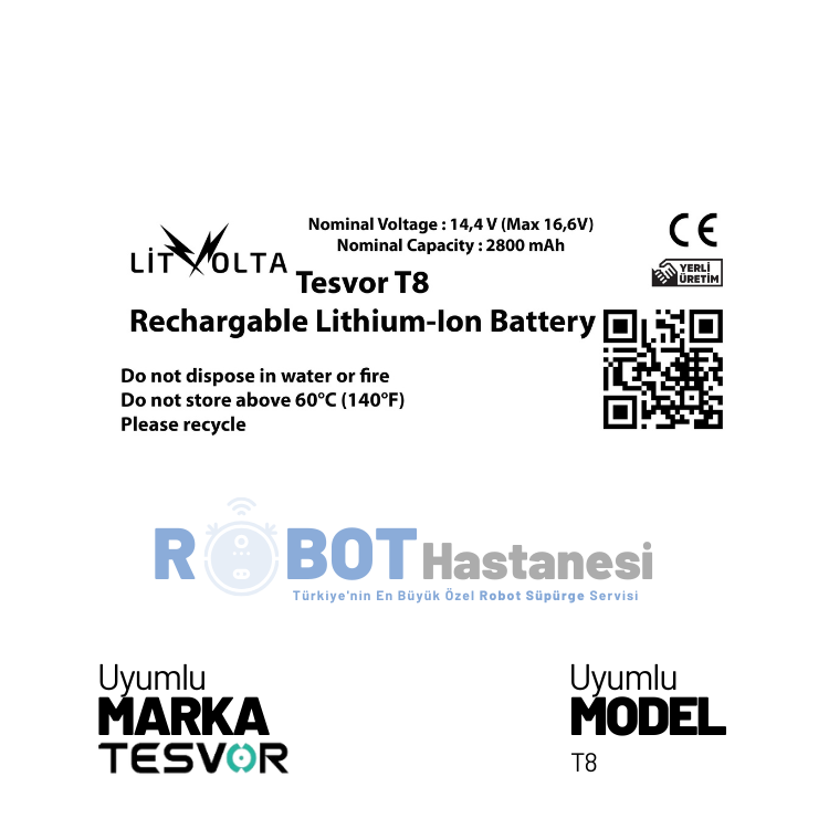 Tesvor marka T8 modeli robot süpürgeniz için yedek batarya / pil yedek parçası. Ürün T8 modeli için %100 uyumlu , tüm testlerden geçmiş ve garantili olarak aynı gün kargo avantajı ile satıştadır.